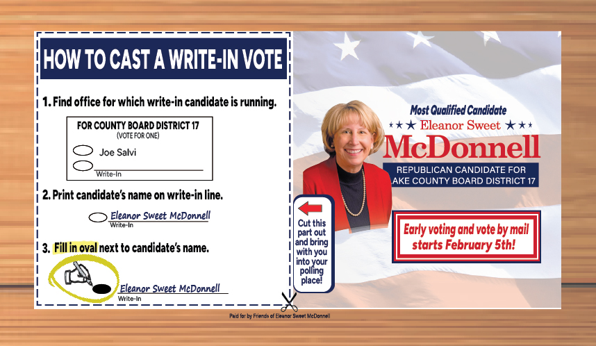 “I am endorsing Eleanor Sweet McDonnell as a candidate for the Lake County Board – District 17. I strongly suggest you vote for her in the March 20th primary!”