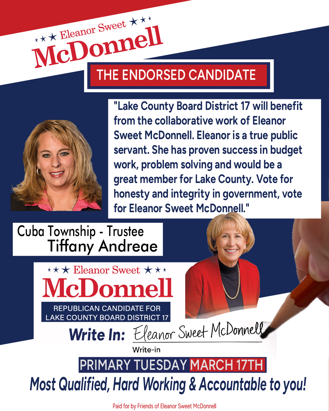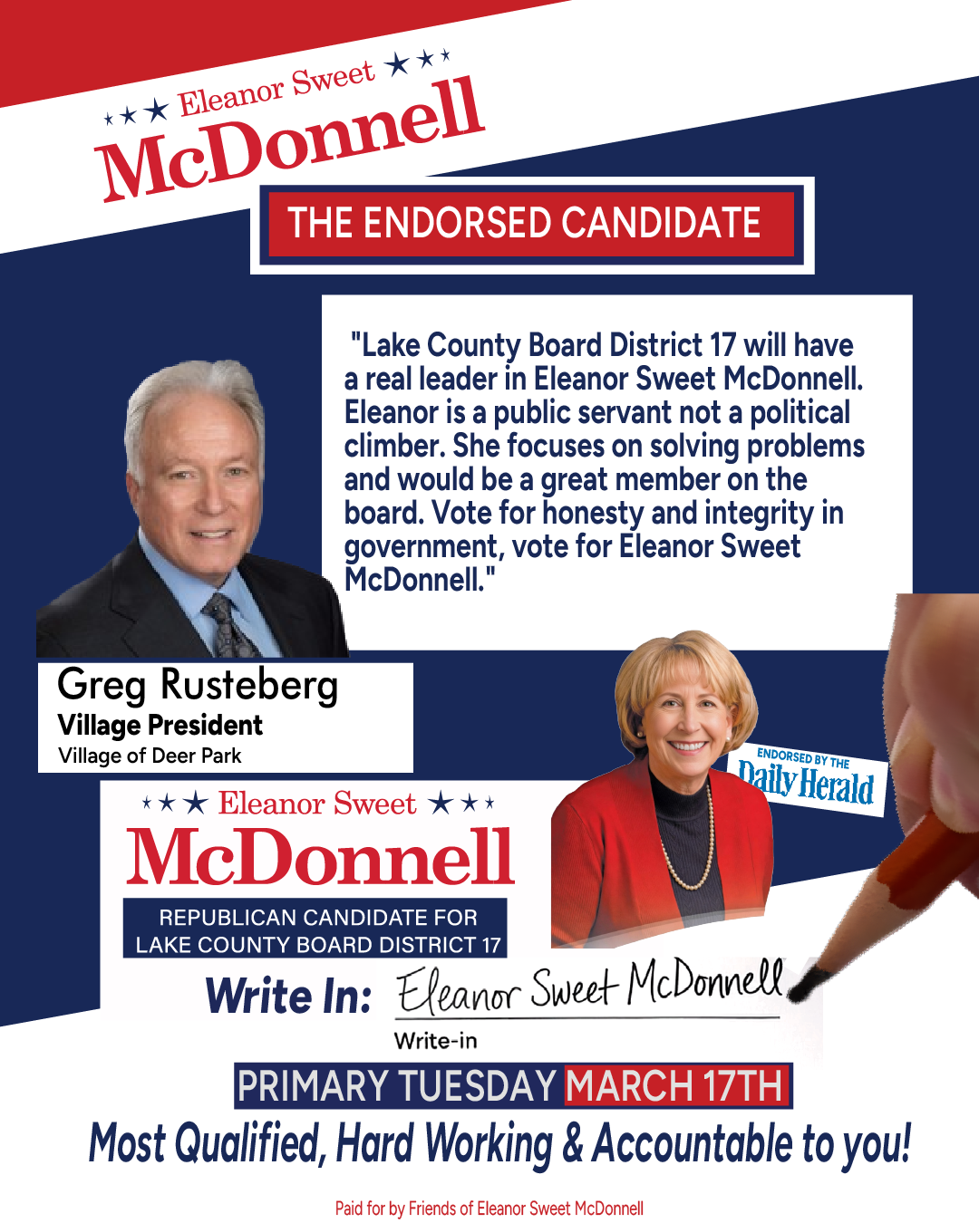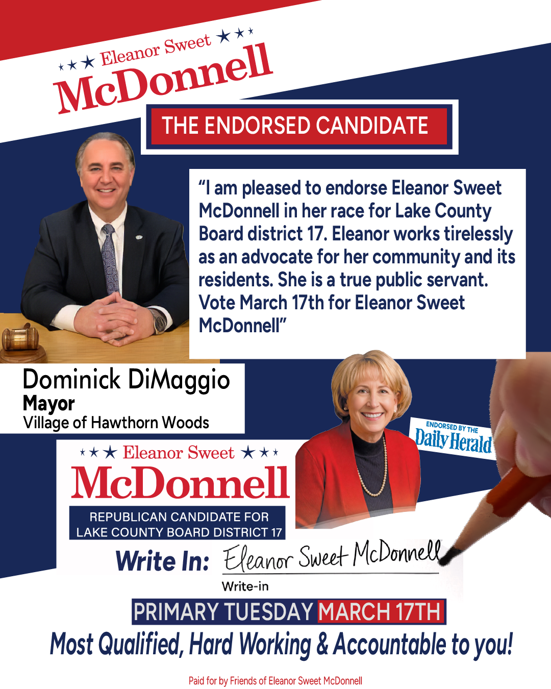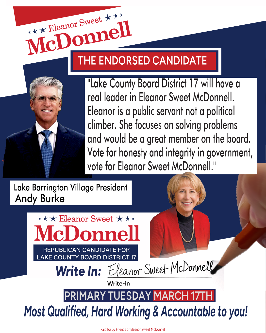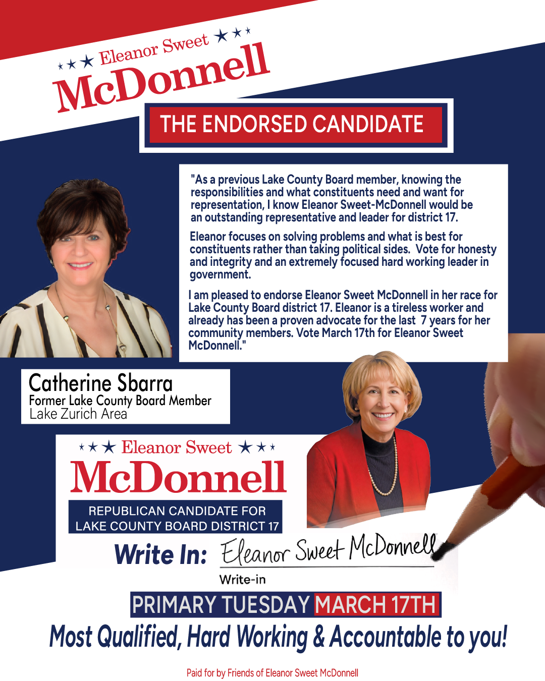 “I am endorsing Eleanor Sweet McDonnell as a candidate for the Lake County Board – District 17. I strongly suggest you vote for her in the March 20th primary!”