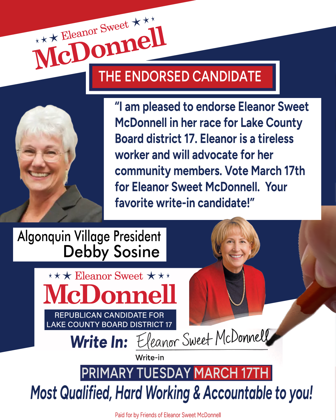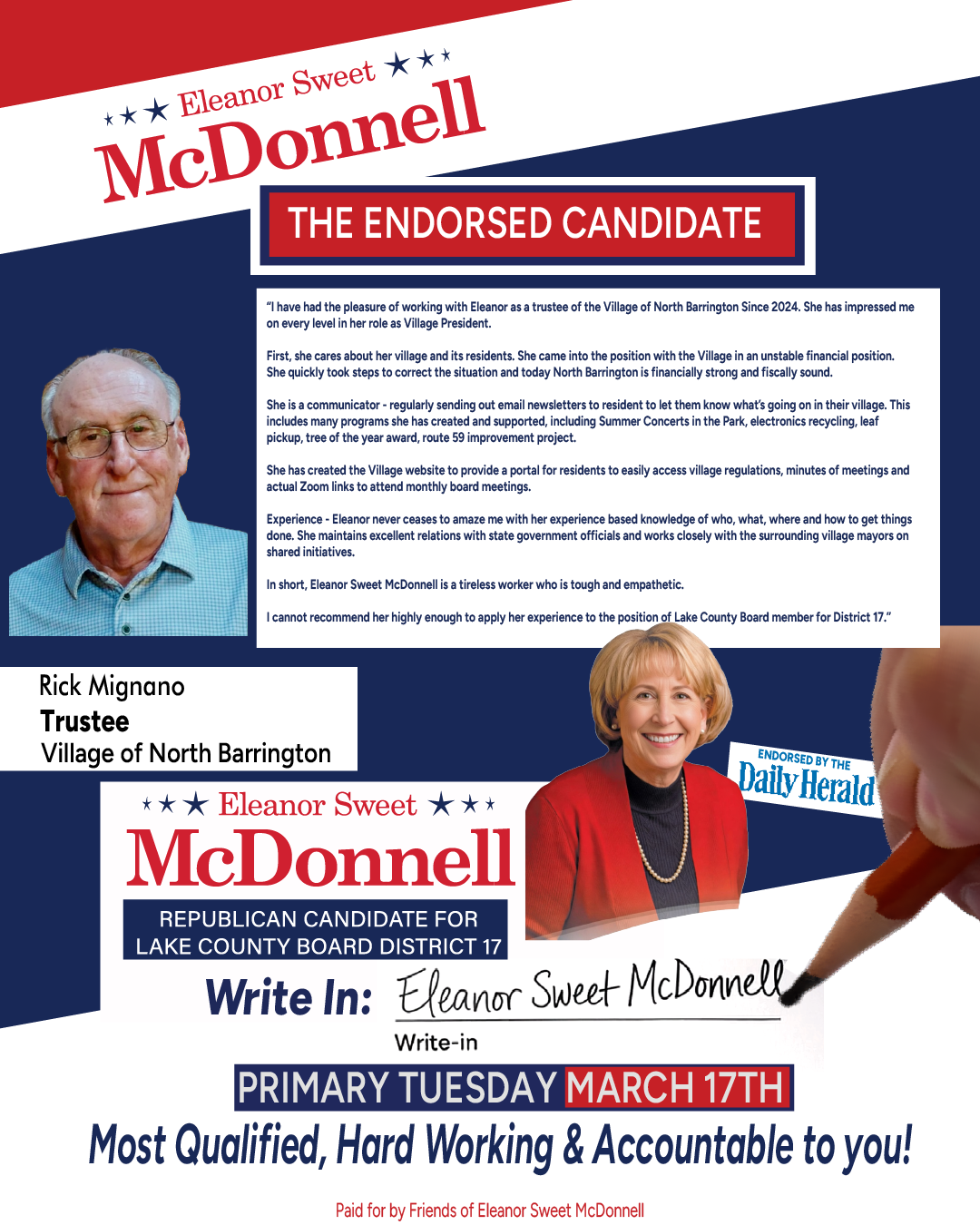 "Eleanor Sweet McDonnell has been a resident of North Barrington and Lake County for over 33 years. She has made substantial contributions to our village and its residents. We sincerely believe that Eleanor is the best person to be our representative on the Lake County Board and will more effectively serve our interests."